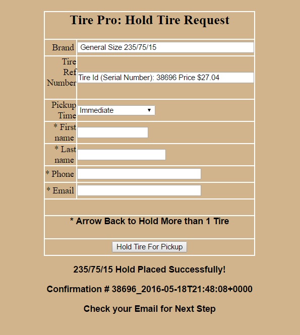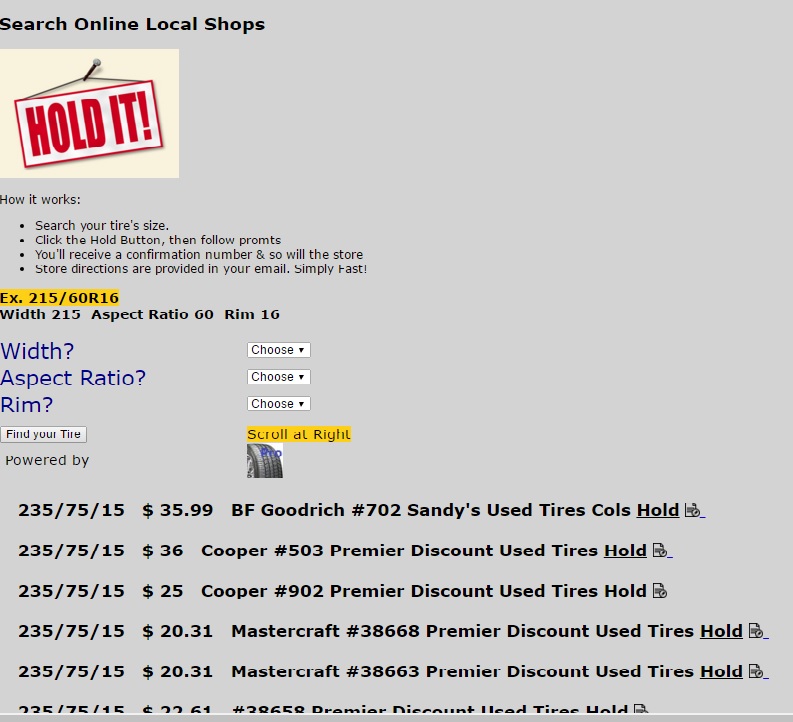 If new to used tire buying, Click Here for tips prior to arrival. Drive to the Used Tire Shop & offer your reservation number from the email. Your email also has click by turn directions. Insist the store people show you the tire in good lighting and it's complete condition such as any prior damage and repairs. You've not paid here, only completed a hold / reservation process. Once selected, talk with the tire store people about your needs and make certain to get it done properly.